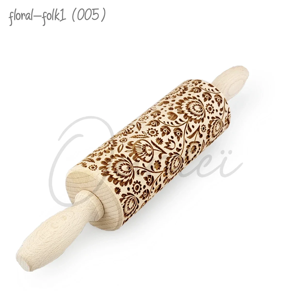 Rouleau en bois gravé à pâtisserie, poterie et céramique - motif floral / folk 1 (005)